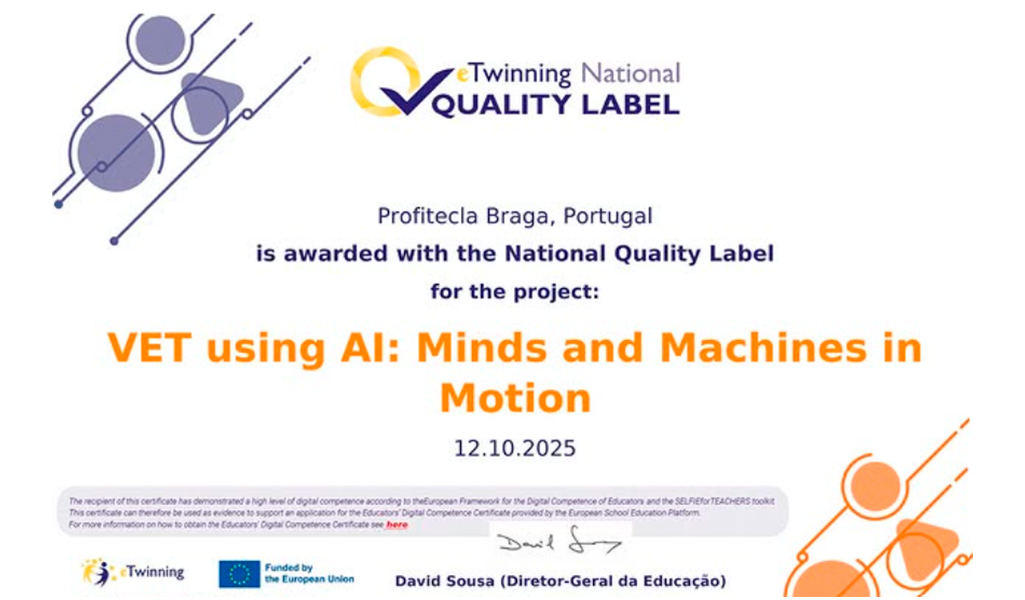 A Profitecla Braga foi distinguida com o Selo Nacional de Qualidade pelo projeto “VET using AI: Minds and Machines in Motion”, desenvolvido no âmbito da rede eTwinning.