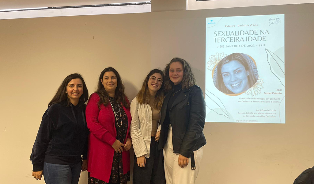 As alunas Beatriz Nunes e Beatriz Santos, finalistas do curso de Geriatria do polo do Porto, no âmbito do seu projeto de PAP “Amar sem limite“, organizaram uma palestra no Auditório da escola, para a qual convidaram a Dr.ª Isabel Peixoto, que abordou a temática da vivência da sexualidade, nomeadamente nos idosos.